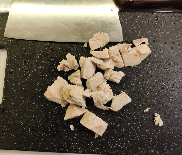 Тем временем порежу саму куриную грудку, как раз осталось немного.