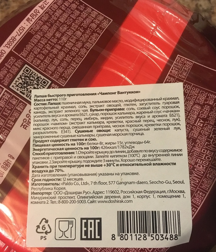 На упаковке русских надписей нет, выручает наклейка импортера. В составе мы можем увидеть сушеные овощи и грибочки. А вот слова "красный перец", употребленные в составе несколько раз меня немного пугают - не фанат я острого, которое жжет тебя по три раза. Мой максимум - красный дошик и крылышки KFC. Интернет тоже кричит о том что это очень острый дошик, но тем не менее, как говорится, назвался груздем ученым...