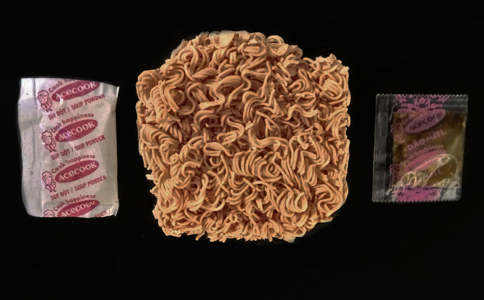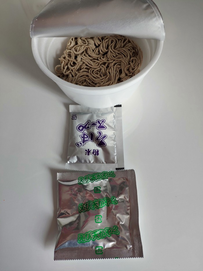 Комплектация стандартная: лапшовый параллелепипед и два пакета с чем-то вроде порошка и чем-то вроде масла.