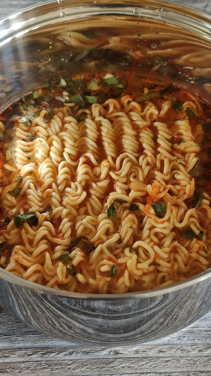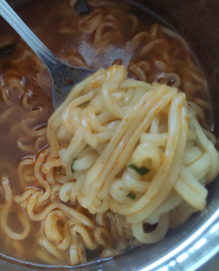 На вкус - на удивление обычно, но остро. Чёрт его знает, какая там произошла химическая реакция, но из жирного масла и почти не острой приправы вышел довольно острый бульон. И он с поистине материнской нежностью обволакивает каждую макаронинку, делая поедание куда интереснее.