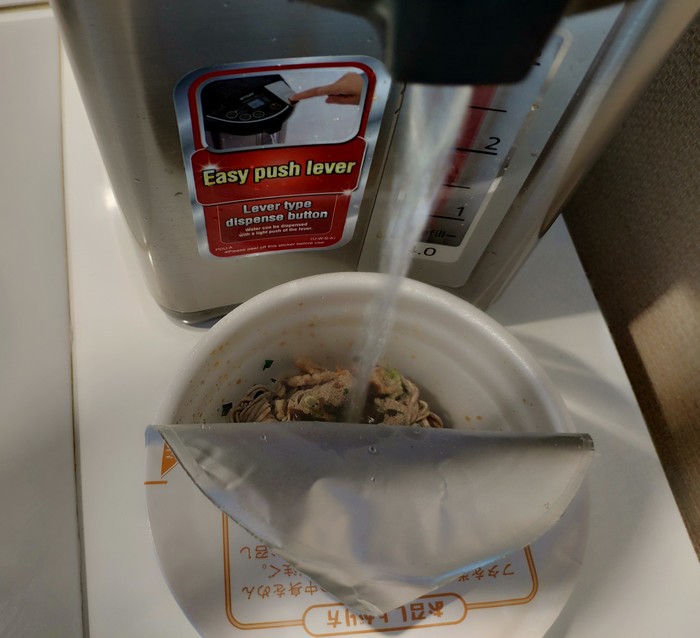 Приправа здесь на удивление не особо острая. Зато это одна из самых ярких бульонных основ, что я видел. Говорят, оранжевый цвет поднимает настроение. Институт Доширакологии утверждает: еда тоже поднимает настроение.