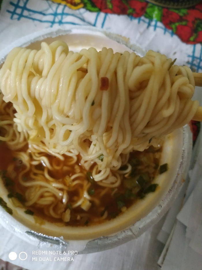 Лапша тонкая бульон белый, лук зеленый и кунжут жареный. Аромат и вкус этой лапши довольно экстравагантен и необычен, отлично подойдет тем кто не любит острое, а любит лапшичку понажористей. Это блюдо, за счет свиного жира убивает голод на раз и на два, скушав вечером можно потом и всю ночь творить. Кунжута много, чеснока не очень, так что и на работе можно захомячить и не распугать потом коллег своим дыханием.