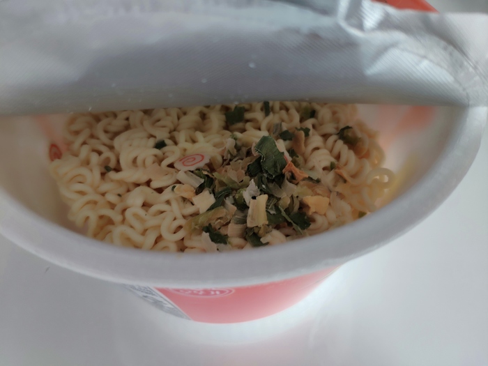 Обилие пакетиков радует, тем более часть ингредиентов уже находятся в лапше. Вываливаем их в стакан.