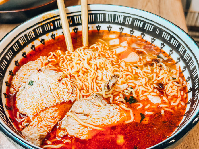 Так как просто куриный вкус меня не сильно веселил, то решил приукрасить свой "рамен". А именно. Добавил пару палочек сурими, пару ломтиков запеченной свиной лопатки.