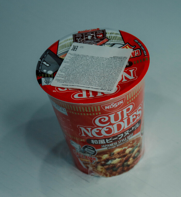Дегустация. Готовим лапшу согласно комиксу на оборотной стороне пачки, благо это совсем нетрудно: выкладываем фунчозу, освобождённую от полиэтилена, и содержимое трёх пакетиков в миску, заливаем кипятком, накрываем крышкой и ждём четыре минуты. Спустя положенное время снимаем крышку и видим варево насыщенного кровавого цвета, в котором плавает размякшая фунчоза в компании соевых бобов и почему-то кунжута (ты откуда, друг, в приправе я тебя не заметил). Добавляем уксус (почему-то я решил, что вот этот маленький пакет на последней пикче должен обозначать именно уксус) и приступаем к дегустации.