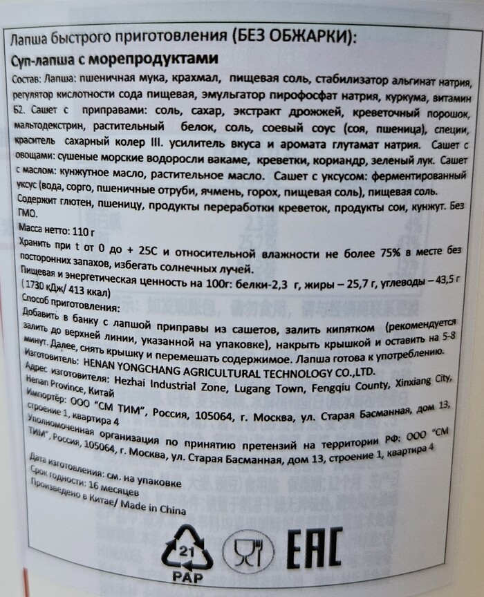 И снова здравствуйте, дорогие друзья, подписчики, критики и все, кто читает. Сердечно рад вас приветствовать! Наша лаборатория продолжает свою работу в сумасшедшем режиме 1/6. Сегодня к нам попал суп-лапша с морепродуктами от китайского производителя с труднопроизносимым и длинным названием. Кого заинтересовало прочитаете на стикере. Для наших энергосберегающих друзей из ЛЛ: очень приятное блюдо! Данный продукт завершающий из партии лапши, приобретённой на Мегамаркете с целью истратить бонусы. Конкретно этот образец обошёлся мне в 24 рубля, при цене более 300. Упаковка – среднего размера бумажный стакан белого цвета. На стакане китайский ребёнок обнимает чашку с лапшой. Поверх информации от производителя на китайском языке налеплен русскоязычный стикер.