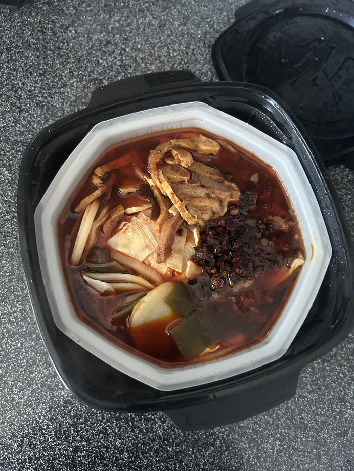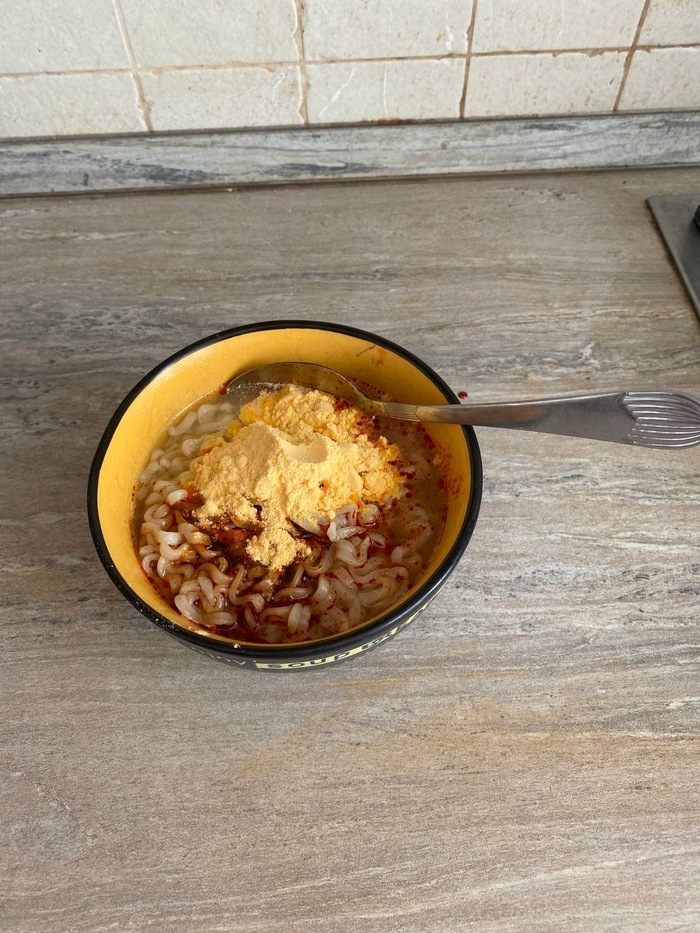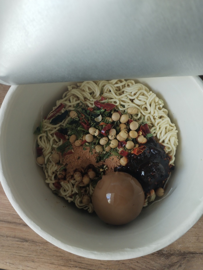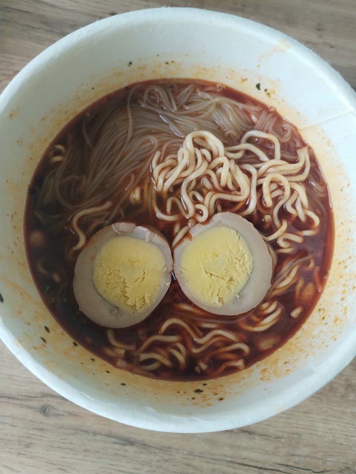 Лапша осталась довольно упругой и эластичной, тоньше классического доширака, вкусная, скользкая правда очень. Фунчоза приобрела сероватый цвет, не переломилась, не разбухла, на вкус просто шик, очень понравилась. Яйцо - белок так же и остался резиновым, желток нежный, вкусный, но какого-то маринада не ощущается от слова совсем, в целом, хорошо так добавляет нажористости блюду. Бульон - густой, жирный, ароматный, с овощами и соевыми бобами (не развалились в кашу, но и не хрустели, само то получилось), острота приятная, хоть и не слабая. Слезы не текли, но носом шмыгалось) . Примерно как самый не острый самъёнг, сырный или карбонара. в общем, за свою цену просто бомба, огромная порция лапши, наваристого бульона и плюс яйцо, вполне себе полноценный обед, рекомендую