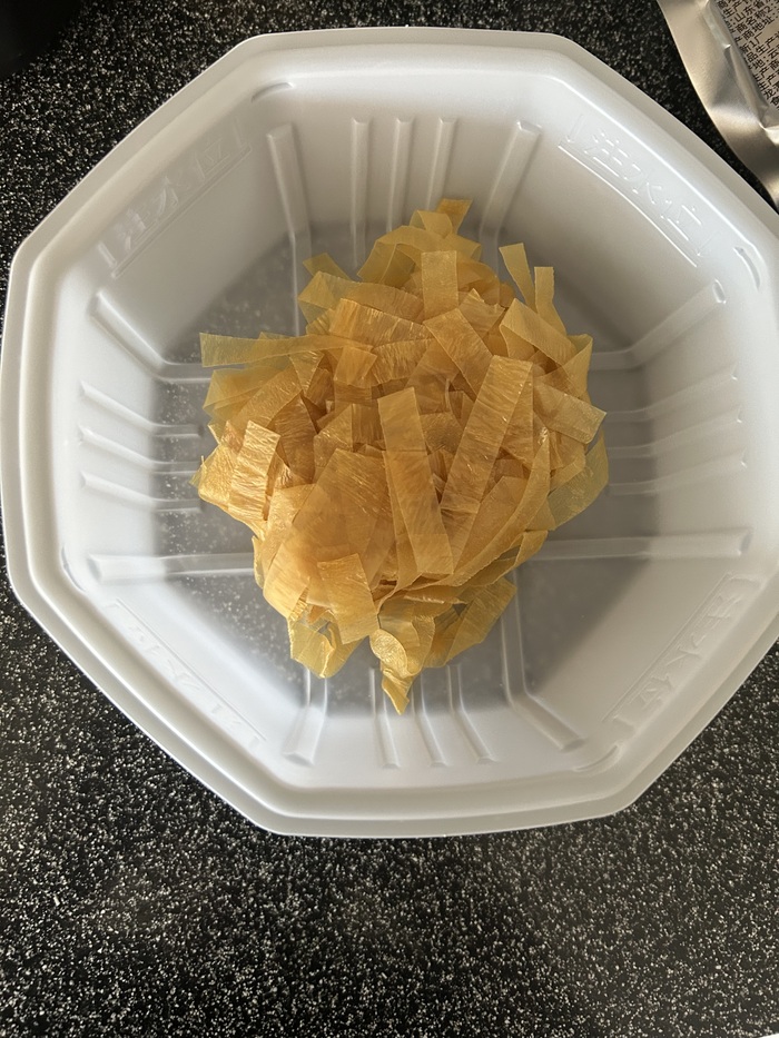 Влажная лапша странного вида (оказалось это соевая лапша, иногда в другие лапши такие кладут в виде спиралек,они в кипятке раскрываются, но чтобы клали такое вместо лапши, вижу в первый раз).