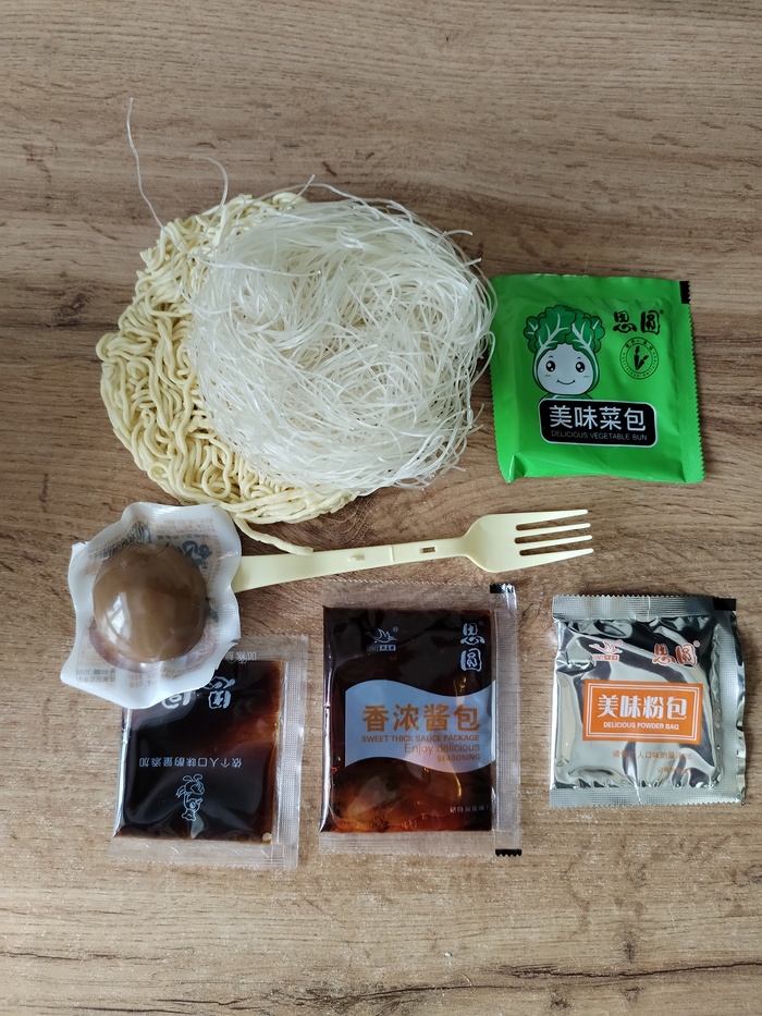 В упаковке вы найдете все необходимые ингредиенты: соевый соус, специи, кисло-сладкий соус, вилку для удобства, сушеные овощи и, конечно, фунчозу