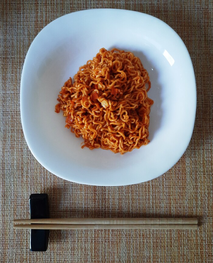 Наливаем 350 мл. воды в кастрюлю и доводим до кипения, далее закидываем брикет лапши на 2-3 минуты кипения.