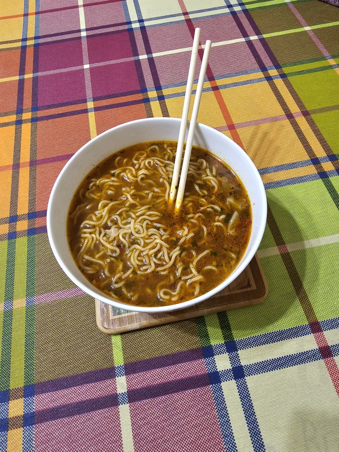 В конечном счете Андо придумал поливать тесто супом из лейки. Подсохшее на воздухе тесто он месил руками. Так получилась первая в мире лапша быстрого приготовления с куриным вкусом.