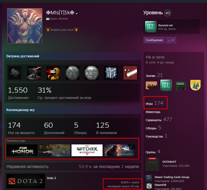 Получается, чтобы восстановить аккаунт нужно доказать, что ты не верблюд, а получить бан - просто за свои слова, которые доказывать не требуется. Все бы ничего, скажете Вы, создайте новый аккаунт и не парьтесь, но в этот аккаунт было вложено более 1000$ в переводе на современные деньги. Аккаунту 17 лет, муж владел им более 14 лет. На аккаунт куплены такие игры как THE WITCHER 2, THE WITCHER 3 WILD HUNT, FOR HONOR, вся серия Dark Souls, CS GO, DOTA 2 (да, последние 2 игры сейчас находятся в свободном доступе, но в далеком 2012 году их пришлось купить). Только в DOTA 2 инвентарь состоит из 3 аркан которые являются эксклюзивными, приобрести их нельзя, более 300 обмениваемых предметов различного качества (большинство из которых имеют редкость Immortal, Legendary), различных вариантов ландшафта, крипов и всего остального). Кроме того, никто явно не вернет достижение прохождения испытания всех героев (оно пройдено несколько раз), да и в принципе всех достижений за эти годы....