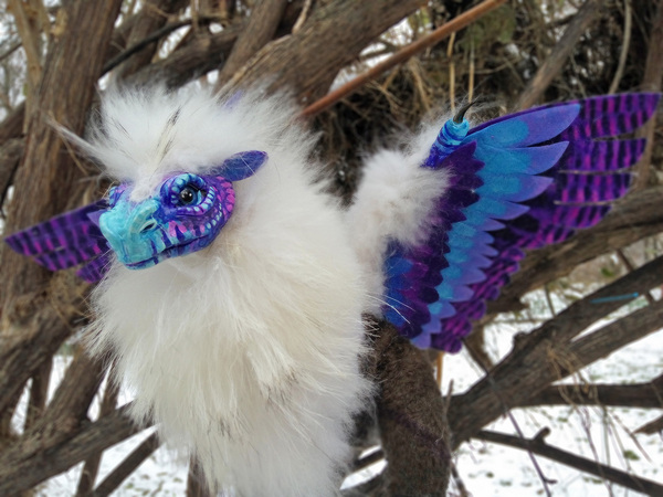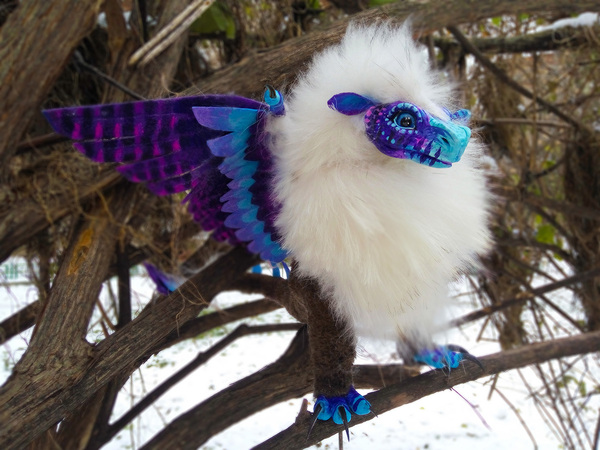 Вот в принципе с него все и началось) Стальной каркас, немного ткани,фетра, глины, когти ястреба и шерсть песца и, возможно, не своей смертью умершего плюшевого медведя, породили это двуногое чудо. Проба пера. Люблю драконов и почему-то все, что я леплю, выходит слишком драконистым))) На зверя ушло два выходных в жадном желании увидеть результат(около 14 часов) .Парень получился высокий почти 30 см и приятно весомый))