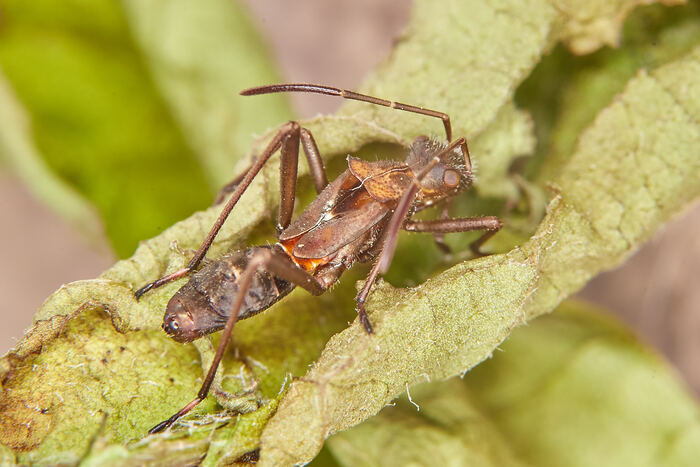 Этот насекомыш привлёк внимание необычным видом. То ли муравей, то ли клоп. Конечно, при рассмотрении сложно упустить из виду длинный хоботок, спрятанный под грудью. Но издалека он выглядит точно как муравей. По-моему даже очень похоже на древоточцев - Camponotus.