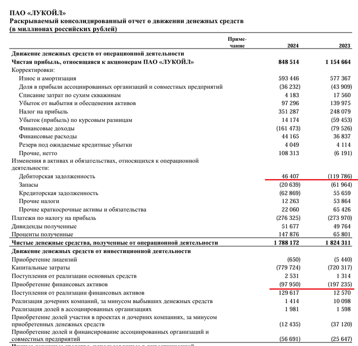 ⬇️ OCF незначительно снизился до 1,79₽ трлн (-2% г/г), с учётом CAPEXа до 779,7₽ млрд (+8,2% г/г), то скорректированный FCF составил 738,4₽ млрд (-15,2% г/г). Согласно див. политике компании на дивиденды направляют 100% FCF (скорректированного), это значит, что FCF хватает на выплату 1065₽ на акцию, но ЛУКОЙЛ заплатил за I полугодие — 514₽ на акцию, а за II полугодие рекомендовал 541₽ на акцию, но дивиденд за год всё равно рекордный.