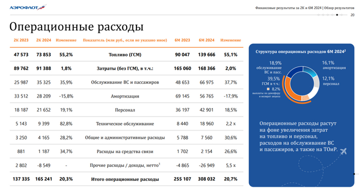 💬 Выручка возросла на значимый % благодаря росту пассажирооборота, объёму грузоперевозок (+30% г/г) и увеличению тарифов на внутренние (+23% г/г) и международные линии (+4,9% г/г). Опер. расходы увеличились до 308₽ млрд (+20,7% г/г), главные статьи растрат: авиационное топливо — 140₽ млрд (+55,1% г/г, объём перевозок и налёт часов повысился, подскочила цена на керосин +22,9%), обслуживание воздушных судов — 67₽ млрд (+37,7% г/г) и ТО судов — 19₽ млрд (рост в 2,2 раза). Расход на амортизацию и таможенные пошлины сократился до 56,8₽ млрд (-17,9% г/г) из-за восстановления резервов перед возвратом по ВС. Обратите внимание на статью прочие расходы/доходы, там -27₽ млрд (в прошлом году -4,9₽ млрд), в состав данной статьи вошёл положительный эффект от страхового урегулирования отношений с иностранными лизингодателями в размере 8,8₽ млрд и доходы от возврата акциза за авиатопливо/демпферные выплаты — 28,9₽ млрд. Как итог опер. прибыль составила 69,2₽ млрд (годом ранее убыток в 2,9₽ млрд, больше половины опер. прибыли в этому году составил разовый эффект и помощь государства).