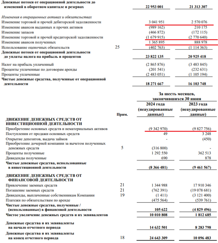 💡 OCF составил 18,3₽ млрд (+13,7% г/г), увеличение связано с изменением в рабочем капитале (рассчитались с дебиторкой и меньше заплатили по задолженностям). CAPEX сократили — 9,7₽ млрд (-1% г/г), в принципе уже выходила новость, что компания планирует вложить 23₽ млрд на инвестиции в 2024 г., это на 27,3% меньше фактического показателя 2023 г. Как итог, FCF составил 9,9₽ млрд (+47,8% г/г), его хватает на выплату 0,087₽ на акцию в виде дивидендов, но в последнее время компания платит около 33% от ЧП (остальные 17% уходят на инвестиции в развитие, по див. политике ЧП может корректироваться). Это 0,031₽ на акцию за I п. 2024 г. (~11,2% див. доходности), остальной FCF явно пойдёт на инвестиции/гашение долга/формирования денежной позиции.