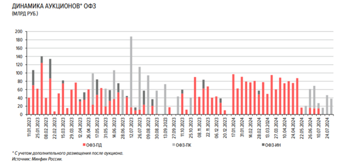 Спрос в классике был увесистым — 86,4₽ млрд, выручка — 14,3₽ млрд (средневзвешенная цена —82,67%, доходность — 15,8%). Спрос во флоатаре был ошеломляющим — 236,6₽ млрд, выручка составила — 45,9₽ млрд (средневзвешенная цена —95,7%). Таким образом, Минфин заработал за этот аукцион 60,2₽ млрд. Согласно плану Минфина на III кв. 2024 г. необходимо разместить 1,5₽ трлн (размещено 261,4₽ млрд, осталось 7 недель), план трудновыполним, если не использовать доп. размещения и флоатеры по полной.