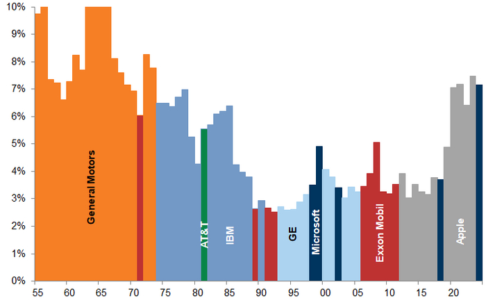 Высокая концентрация акций не является чем-то необычным. Как показано ниже, крупнейшие компании ранее в истории часто занимали более высокую долю в общей капитализации рынка, чем крупнейшая компания сегодня. Причем это происходило в течение более длительного периода времени.