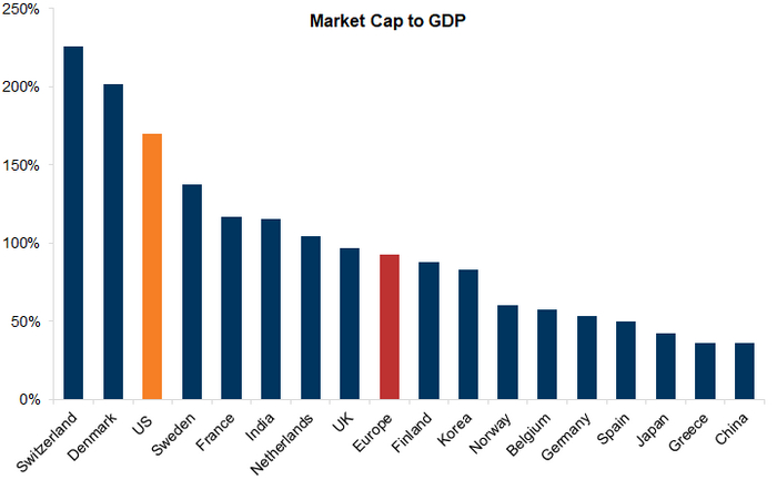 Только Швейцария и Дания (гораздо меньшие по размеру экономики) имеют более высокий «Индикатор Баффета», чем у США. Кстати, интересный факт: в случае Дании это главным образом отражает размер компании Novo Nordisk, чья рыночная стоимость сама по себе превышает годовой ВВП датской экономики.