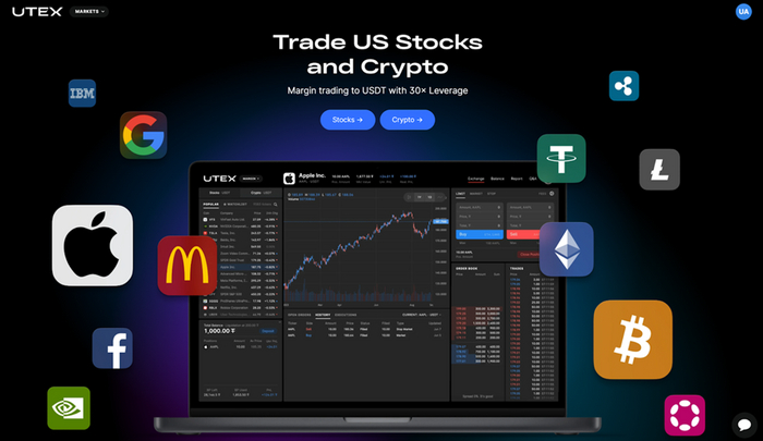 В чем главная фишка UTEX – простой доступ к торговле акциями США за криптовалюту. Главный плюс — легко можно пополнять счет и выводить средства в USDT. При этом вы получаете ничем не ограниченный доступ к 4 рынкам США (NYSE, Nasdaq, AMEX, BATS) и можете выбирать из тысяч акций и ETF. Разработчики планируют добавить и другие инструменты. Доступны сделки в лонг и шорт. Трейдеры могут использовать собственные средства или взять кредитное плечо до 30х.