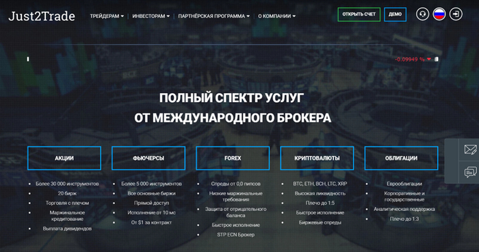 Минус в том, что доступ к сайтам Just2Trade для российских пользователей временно доступен только через VPN. Причина блокировок в РФ: работа брокера с криптовалютами, которые пока не имеют понятного юридического статуса в России.