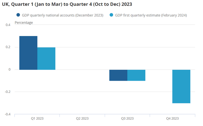 По предварительным оценкам, ВВП Великобритании упал на 0,3% в 4 квартале (с октября по декабрь) 2023 года после непредвиденного падения на 0,1% в предыдущем квартале. А что это технически? Это рецессия.