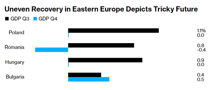 ВВП Румынии неожиданно сократился на 0,4% по сравнению с предыдущими тремя месяцами, вопреки ожиданиям роста. В Венгрии и Польше рост застопорился.
