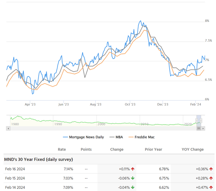 Ипотечные ставки в США. В пятницу был новый локальный хай - 7,14%. Верим, ждём, надеемся. Двузначное смотрелось бы добро.