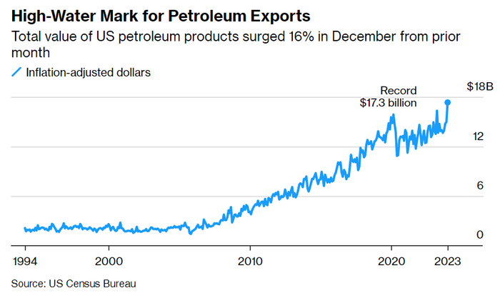 Не только добыча нефти в США достигла рекордного уровня в 2023 году — общая стоимость экспортируемых нефтепродуктов также достигла пика, увеличившись только за декабрь на 17,3 миллиарда долларов, согласно данным Бюро переписи населения.