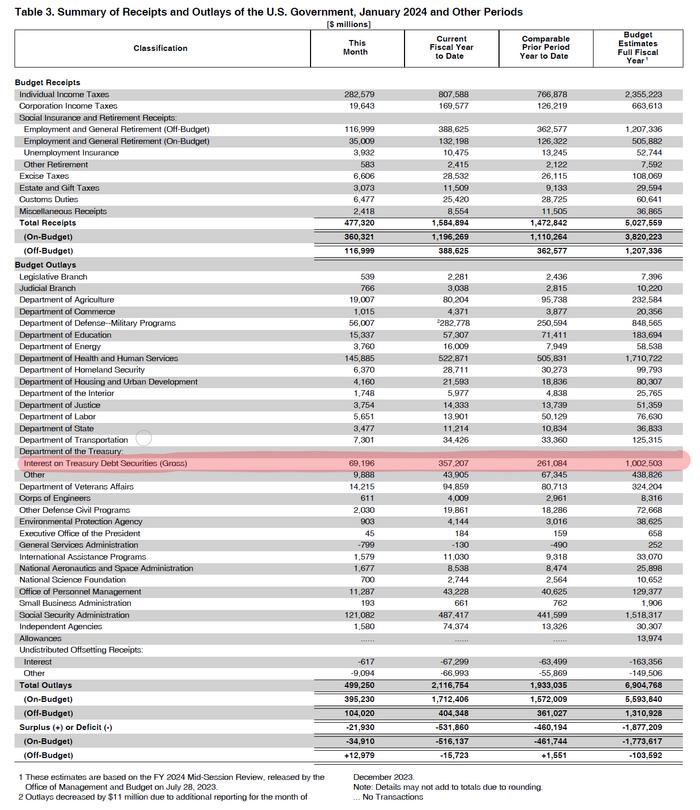 Проценты по обслуживанию долга по казначейским бумагам в США по итогам января 2024 уже составили 357 млрд $, что на 37% больше, чем за аналогичный период прошлого года. Это даже больше военных расходов. В целом по текущему финансовому году прогнозируют более 1 трлн $ расходов на обслуживание долга.