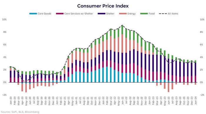 После 3,4% в декабре прошлого года. Но понижение ожидалось куда как существеннее - до 2,9%. Основную долю в росте цен занимают расходы на жилье - Shelter. Этот показатель стоимости жилья основывается на арендной плате, а не на ценах на жилье. И даже по тем, у кого жилье своё, расчёт ведётся так, как если бы они это жилье снимали. В общем, свои заморочки.