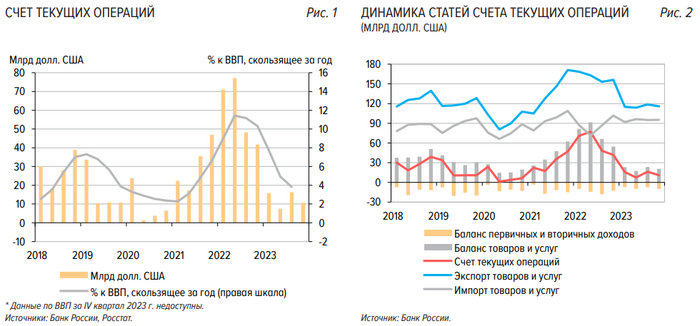 Экспорт товаров в 2023 году сократился по сравнению с 2022 годом в большей степени из-за снижения мировых цен на сырьевые товары. Его стоимостный объем сложился около уровня 2019 года. Физические объёмы экспорта в 2023 году были меньше, чем в 2021 году, из-за внешнеторговых ограничений.