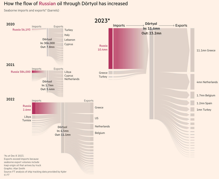 Владелец терминала в Дёртйоле, компания GTS, сказала Kpler «Давай, до свидания!» - согласно турецким таможенным данным, российские объемы нефти составили в 2023 году 10% «общей погрузочной активности». В среднем по 300 000 тонн в год. А кто мы такие, чтобы не верить нашей таможне. А кто вы такие (Kpler), чтобы оспаривать нашу таможню.