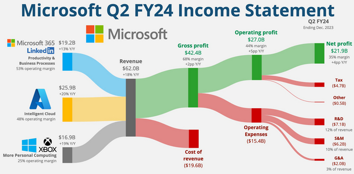 Практически 26 млрд $ принесли серверные продукты и облачные сервисы. Выручка по данному направлению за год выросла на 20%.