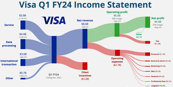 Всё стандартно для платёжных систем. Комиссии, процессинг, трансграничные платежи. В общем, чистого профита за квартал вышло 4,9 млрд $, что на 4% выше, чем год назад.
