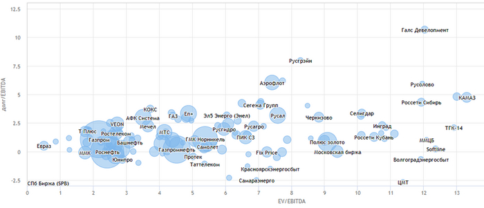 И дальше мы никуда не посмотрим, и в этом и кроется часть проблемы. К сожалению акции не оценивают в процентных ставках, поэтому универсальный бенчмарк для сравнения разных активов использовать будет сложно. Бизнес как правило оценивают в мультипликаторах - в годовых квази денежных потоках или прибылях, которые принесет та или иная компания. В качестве самого распространенного прокси денежного потока используется EBITDA, как показатель максимально простой в расчете и приближенный к реальному операционному денежному потоку. Например, голубые фишки на ММВБ торгуются сейчас на уровне 3-5 EBITDA. Ниже графики представлены со Smart-Lab.