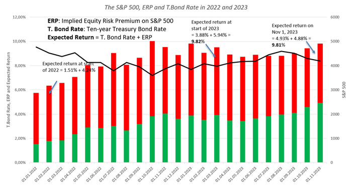 Чем отличается долг от эквити? Позвольте напомнить очень простую, но фундаментальную истину. Ключевым отличием является то, что по долгу выплаты зафиксированы и они имеет приоритет, а по эквити - нет, и собственник получает то, что осталось. Финансовые рынки устроены таким образом, что для того, чтобы компенсировать дискомфорт от риска инвестирования в эквити - инвесторы требуют более высокую доходность. Если во всем мире растут ставки по долгу, то вслед за ними должны расти и ставки по эквити, иначе какой смысл рисковать за то же вознаграждение? Но этого не происходит. К примеру еще пару лет назад американский долларовый долг стоил 2% (10-летние трежерис), а эквити давал 6%, то сейчас долг стоит 5%, а эквити 10%. Ниже представлена динамика ставки эквити и ее компонентов по данным Дамодарана.