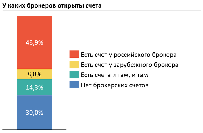 47% используют только российские брокерские счета, 9% – только зарубежные, а 14% держат активы и там, и там. Доля людей без брокерских счетов достигла аж 30% – рост более чем в два раза (в прошлом году было всего 13%)!