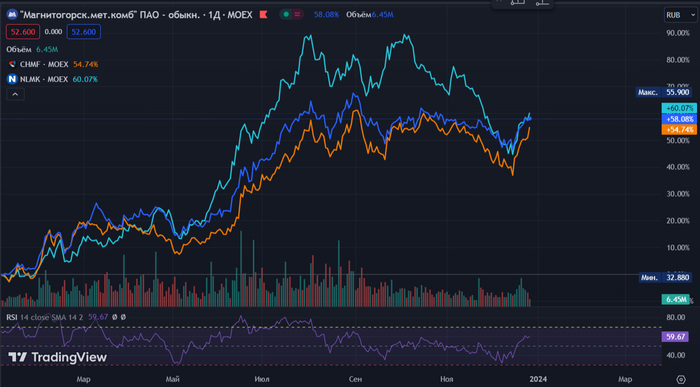 🇷🇺 Как обстоят дела с выпуском стали в России? В ноябре было выпущено — 6,4 млн тонн стали (12,5% г/г), месяцем ранее — 6,3 млн тонн стали, внутренний спрос не даёт снизиться темпу выплавки. По итогам же 11 месяцев: 70,2 млн тонн (6,4% г/г). Учитывая недавнюю коррекцию на фондовом рынке и снижение котировок металлургов, то на сегодняшний день акции сталеваров перешли к планомерному росту. У российских сталеваров есть несколько преимуществ: ослабший ₽, возросший внутренний спрос, стабилизация цен на продукцию (всё это как бы намекает на будущие дивиденды). С начала года рост акций сталеваров составил: НЛМК — 59%, ММК — 58% и Северстали — 54% (позиция Северстали подросла и понятно почему, читайте ниже). Давайте немного подробнее разберём отчёты металлургов: