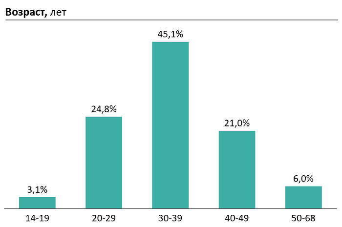 Средний возраст подписчиков, как и в прошлом году, остался на уровне 35 лет. При этом структура, похоже, всё же сдвигается со временем в сторону более молодой аудитории: если в прошлом году на ребят до 30 приходилось всего 22%, то в этом году – уже 28%.