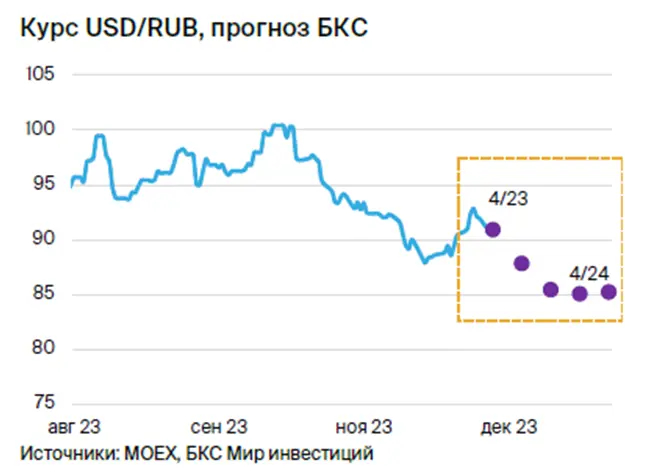 Покупки валюты ЦБ в следующем году могут быть незначительными, и в 1К24 рубль может подорожать до 85 за доллар. Однако возможная отмена обязательной продажи валютной выручки или более низкая цена на нефть вернут его к уровню 90