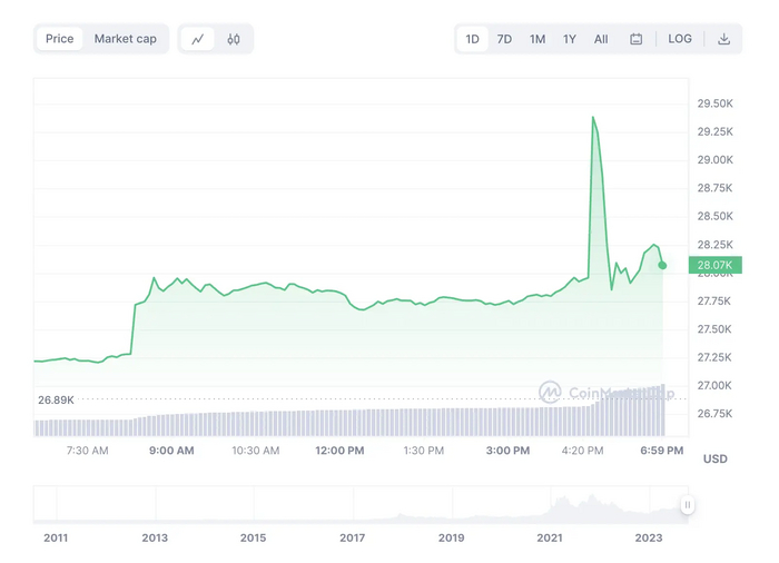 Сегодня биткоин резко вырос до уровня $30 000, но уже спустился назад к $28 000. Что произошло?