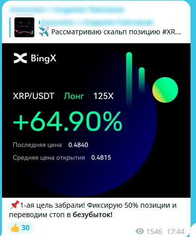Если делать выводы, то скорей всего данный канал торгует "показательно" и просто открывает сделку в любую сторону и ждёт минимального движения до 0.5%, чтобы сделать скрин и опубликовать его, как "профит".