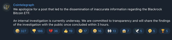 Новость от SEC была умеренно бычьей, так что трейдеры были настроены на позитивный лад. Внезапно, издание Cointelegraph в своем Twitter (X) и Telegram опубликовало следующий текст: