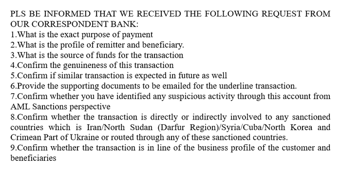Пример запроса от банка-корреспондента в связи с отправкой валюты из России в ОАЭ: «поклянитесь кровью на этих девяти пунктах, что эти деньги чище, чем зарплата Папы Римского!»