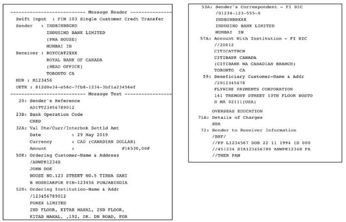 Типичная MT103-свифтовка. Информация о назначении платежа содержится в поле под номером 72: поставьте себя на место проверяющего и попробуйте расшифровать – с какой целью отправлены деньги? (И кто такой «FATHER PAN», что за минутка греческой мифологии??)