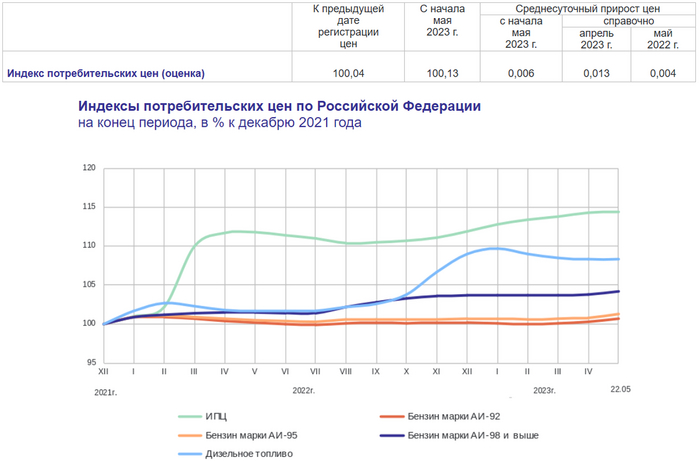 За период с 16 по 22 мая 2023 г цены выросли на 0,04%. Год к году инфляция составила 2,36% г/г.