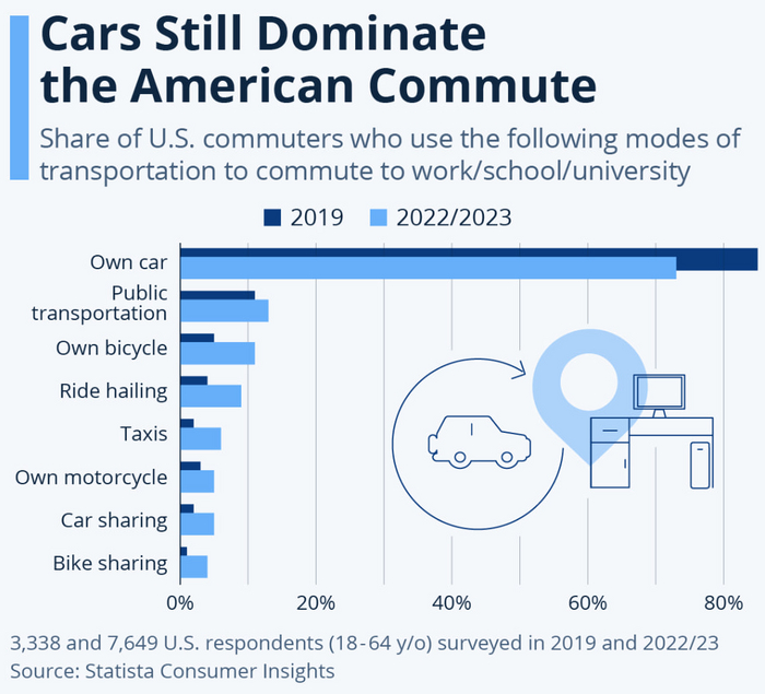 Statista рассказывает нам, что используют американцы для повседневных передвижений дом-работа/университет/школа-дом.