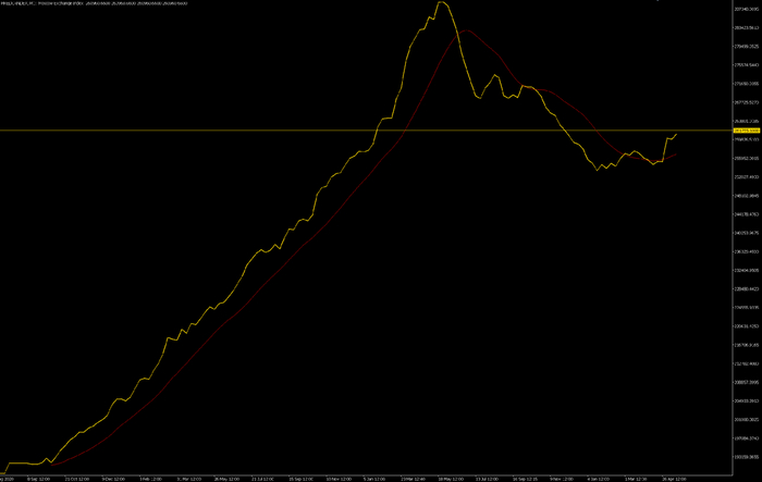Вот он, желтенький. Жаль, что рассчитывается он раз в неделю и не формирует "свечи". А так бы можно было анализировать его с помощью моих лучших в мире индикаторов. Но тем не менее обычную скользящую среднюю на него накинуть можно.